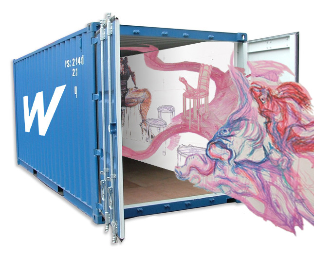 L’association Welchrome a invité l’artiste Alfonse Dagada à réaliser un wall drawing pour l’événement Sea you soon qui se déroule du 11 au 14 juillet à l’occasion de la 6ème Fête de la mer à Boulogne-sur-mer. L’artiste intervient à l’intérieur d’un container en dessinant de son trait incisif et coloré un wall drawing proliférant qui déborde vers l’extérieur. Réalisé principalement au crayon de couleur et à l’encre, ce dessin spectaculaire par ses dimensions représente une coulée de créatures marines à la fois séduisantes et repoussantes. Ces poissons et autres mollusques se déversent sur des éléments construits comme des maisons ou des meubles. Ce « tsunami nourricier » incarne l’ambivalence de l’élément marin, synonyme de ressources mais aussi de dangers.