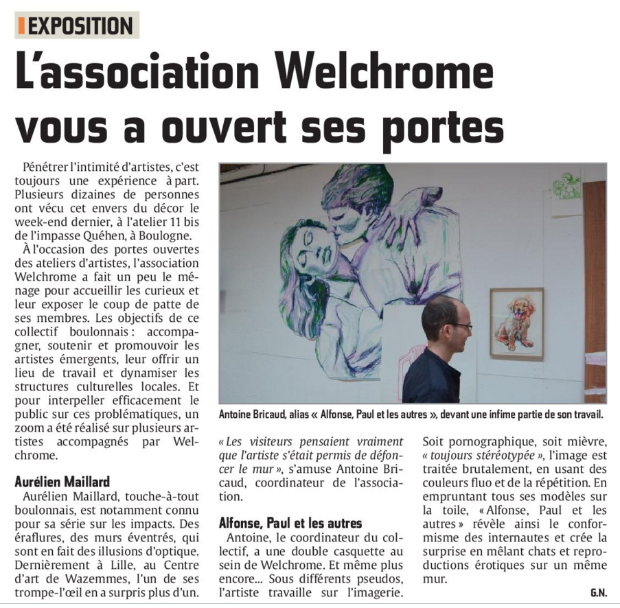 Amandine Faraud, « Boulonnais : le nouveau sésame vers une carrière d’artiste s’appelle Welchrome », La Voix du Nord, Boulogne-sur-Mer (FR), 15 juillet 2013.