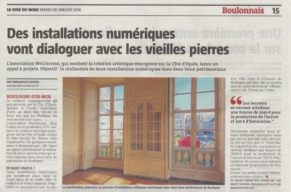 Emmanuelle Dupeux, « Des installations numériques vont dialoguer avec les vieilles pierres », la Voix du Nord, 26 janvier 2016.